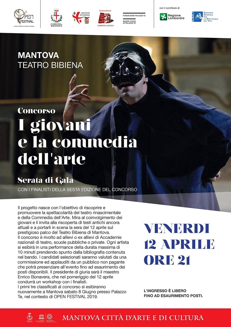 La Fondazione “Umberto Artioli” Mantova Capitale Europea dello Spettacolo con il contributo del Comune di Mantova, organizza la sesta edizione del concorso “I giovani e la commedia dell’arte”, all’interno della stagione “MantovaTeatro 2018/2019” e di “OPEN Festival Teatro Urbano e Nouveau Cirque – seconda edizione”.