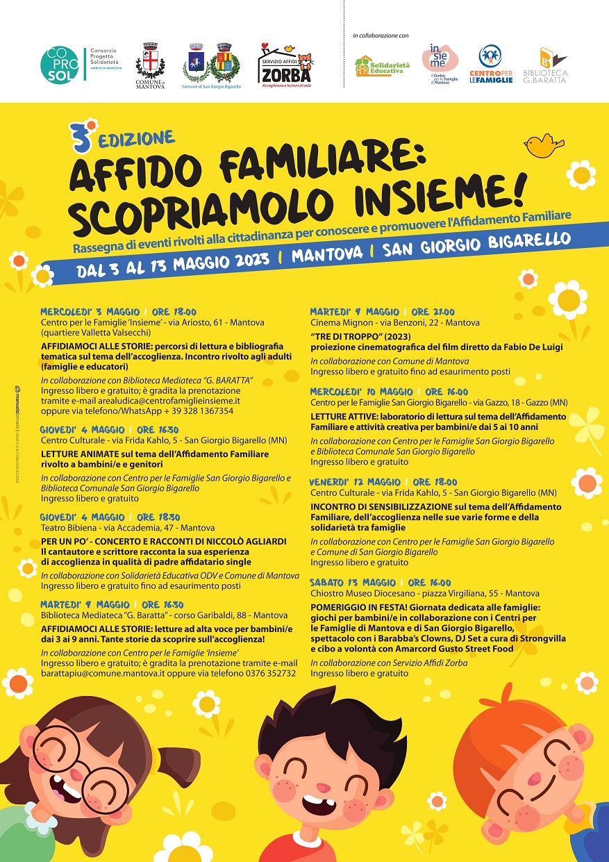 Il programma degli eventi proposti in occasione della Giornata nazionale dell’affidamento familiare nasce dall’impegno profuso dal Consorzio “Progetto Solidarietà” del Distretto di Mantova, che gestisce il Servizio Affidi Zorba (ente di riferimento per gli affidamenti familiari attivi sul territorio), in collaborazione con il Comune di Mantova, il Comune di San Giorgio Bigarello, i Centri per le Famiglie di Mantova e San Giorgio Bigarello e Solidarietà Educativa odv.